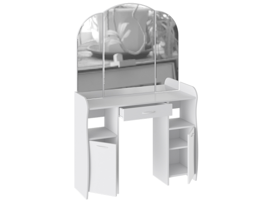 Помимо внешней привлекательности стол оснащен большим зеркалом с поворотными зеркальными створками, вместительную столешницу под которой располагается выдвижной ящик, открытые ниши для хранения и секции с дверцами, где можно разместить все необходимые аксессуары и косметику. Удобные отсеки помогут поддерживать порядок и удобство в Вашем уголке красоты.