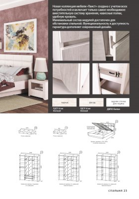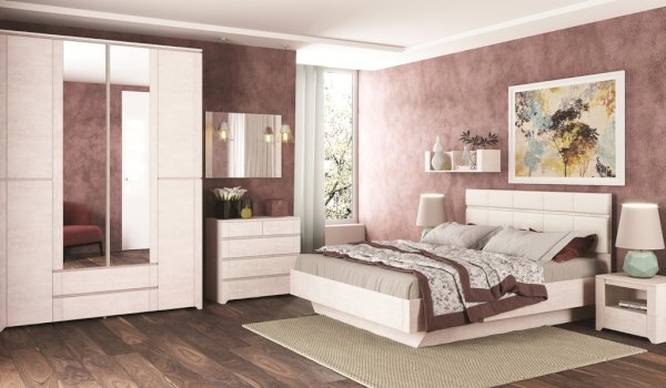 Разнообразие модулей позволит Вам грамотно обустроить комнату, используя при этом минимум пространства. Вместительный 4-х дверный шкаф с зеркалами, широкий комод с навесным зеркалом, открытая полка, удобная двуспальная кровать с подъемным механизмом, прикроватная тумба - такому комплекту мебели будет доволен каждый!