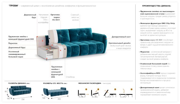 Мягкий диван повышенной комфортности, на котором приятно проводить время. Классический дизайн, округлые мягкие формы, утопающая посадка - все это делает его незаменимым для отдыха. Украшением дивана является декоративная прострочка и стяжки на спинке, подлокотниках и посадочном месте, которая благодаря своим свойствам повышает прочность и износоустойчивость обивки. Две большие подушки регулируют удобство посадки, после сидения моментально восстанавливают первоначальную форму. Механизм трансформации тик-так и мягкие элементы превращают диван в полноценную кровать. Большой бельевой короб для хранения вещей – приятное дополнение к дивану. Универсальный угол - переставляется на левую или правую сторону основной секции, удобно при частых перестановках.