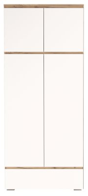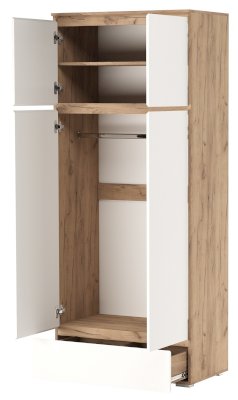 Шкаф 4С1Я с ящиком на направляющих полного выдвижения, с поперечной металлической штангой для верхней одежды, с полками. Применение интегрированной ручки на фасадах делает модель стильной и безопасной – дверцы открываются за профилированные выступы. Фасады обработаны кромкой 1 мм. Черная регулируемая ножка-опора.