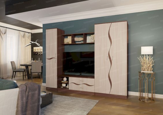 Гостиная «Анапа» — это неброская, изящная модель. Главным ее украшением служит отделка натуральных цветов с достоверной имитацией фактуры благородных сортов древесины. Плавно изогнутые линии на фасаде создают ощущение мягкости и возвышенности. В комплект входят два вместительных шкафа, открытые полочки, тумба. В центральной части гарнитура отведено место под телевизор.