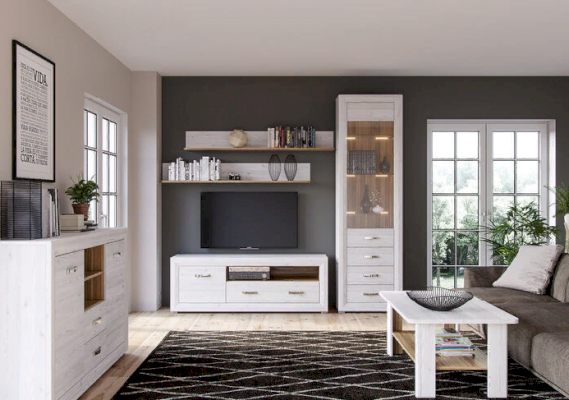 MALTA – коллекция мебели, состоящая из множества функциональных модулей, которые позволяют обустроить любую комнату. Великолепные белоснежные фасады коллекции Malta удачно контрастируют со вставками из «орех лион», продолговатые  металлические ручки добавляют изящества, а подсветка стеклянных полок выгодно подчеркивает древесную структуру дерева.