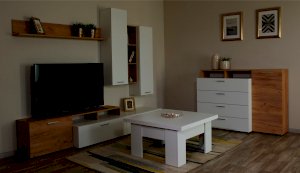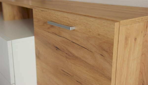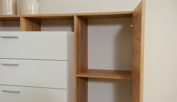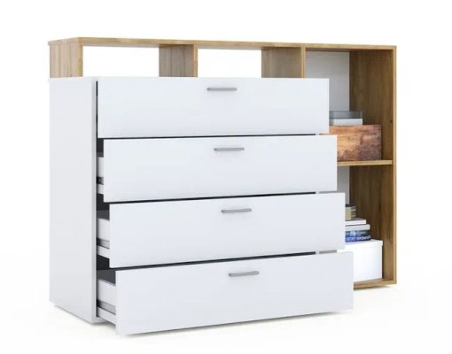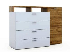 Оригинальный комод Невио – 1 станет незаменимым предметом интерьера в Вашем доме. Яркое сочетание белого цвета с теплым древесным позволит сочетать его с другими предметами мебели и декора, создавать яркие и разнообразные интерьеры. Комод оснащен вместительными ящиками полного выдвижения, открытыми и закрытыми полками. Верхняя крышка комода увеличена на 1 см, что обеспечивает эстетичный вид сверху. Мебель выполнена из высококачественных экологичных материалов