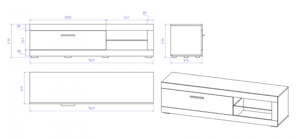 Преимущества: широкая — 1620 мм, можно поставить телевизор с большим экраном; стеклянная полка — выглядит красиво и аккуратно, можно ставить различные украшения и аксессуары; закрытый ящик — вместительное пространство для хранения вещей.