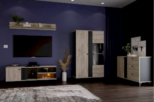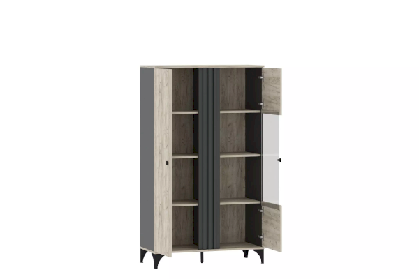 Шкаф оснащен двумя распашными дверьми с полками для хранения вещей. За фасадом из закаленного стекла можно расположить посуду, книги или элементы декора, а высокие опоры обеспечивают быстрый и легкий доступ во время уборки. Сборка шкафа универсальна – фасад-витрина может крепиться как на правую, так и на левую стороны.