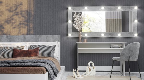 Большое зеркало Инстайл – это предмет интерьера, который помимо своей основной функции, позволит вам визуально расширить пространство и привнести больше света в помещение. Модель можно разместить в любой комнате, как вертикально, так и горизонтально. Рама зеркала изготовлена из ЛДСП в цвете бетон и дополнена по всему периметру лампочками с выключателем.