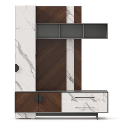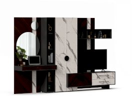 • Модуль скомбинирован из наборной панели, шкафа одностворчатого, тумбы для ТВ и открытых полок