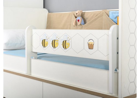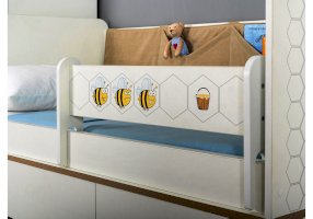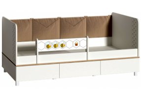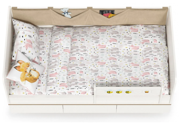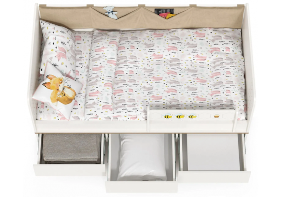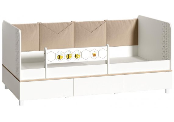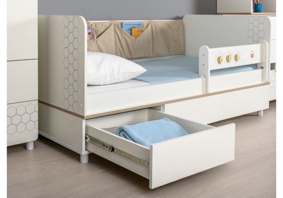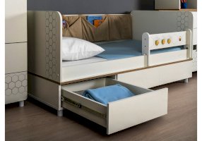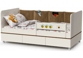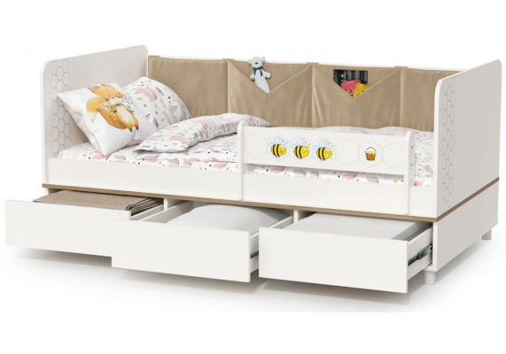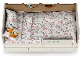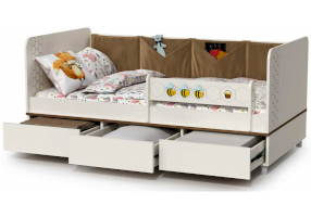 Односпальная кровать оснащена съёмным мягким элементом с карманами — можно легко снять для стирки. Съёмный бортик на кроватке. Оригинальная фотопечать. В основании кроватки размещены - три выкатных ящика.