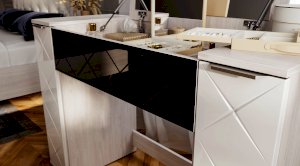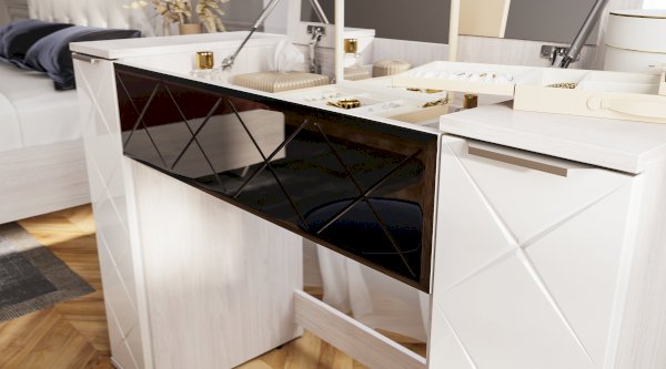 Тумба Кимберли – красивый и функциональный предмет интерьера. Оснащена выдвижной нишей, в которой можно хранить косметику, средства по уходу за собой или другие необходимые вещи. Фасад изделия выполнен в белом глянце и имеет стильную гравировку. Тумба может использоваться как самостоятельно, так и дополнить косметический стол из одноименной модульной коллекции.