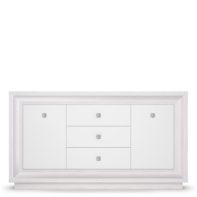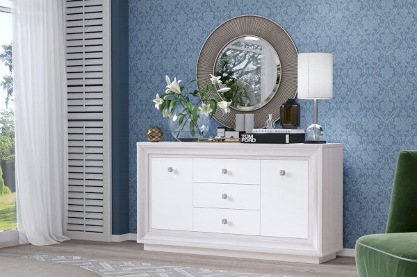Оформление модуля говорит о его принадлежности к стилю Ар-деко. Декоративные элементы, такие как фигурный багет и изысканные ручки создают образ респектабельной мебели. Багет и фасады выполнены из МДФ пленке ПВХ с легким сатиновым эффектом «Жемчуг». Лицевая фурнитура представлена ручками с растительным орнаментом цвета «венецианское серебро». А корпус изделия выполнен из ЛДСП 25 и 16 мм, при этом основные детали выполнены из более толстого полотна, а края обработаны кромкой ПВХ толщиной 2 мм.