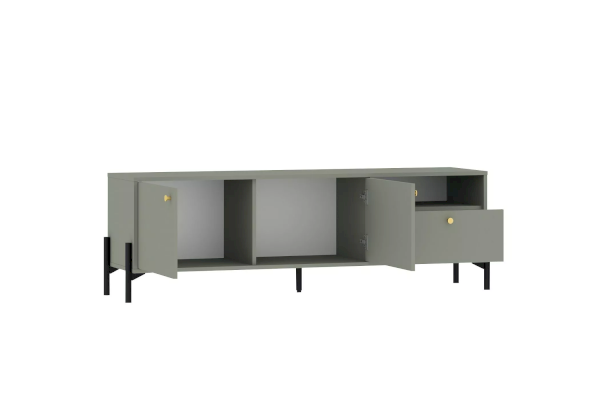 Тумба оснащена двумя полками с распашными дверками, которые закрываются мягко и легко за счет механизма с доводчиком, выдвижным ящиком с системой шариковых направляющих, при помощи которых ящик выдвигается бесшумно, а также открытой нишей. Благодаря комбинации закрытых и открытых ниш можно удобно разместить аудио- и видеоаппаратуры, а также все необходимые книги и предметы интерьера, они не будут разбросаны в хаотичном порядке, а оригинальные высокие опоры обеспечивают быстрый и комфортный доступ при уборке. Дополните тумбу шкафом из одноименной коллекции, чтобы оптимизировать место хранения и создать особо гармоничную атмосферу.