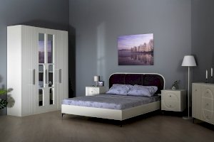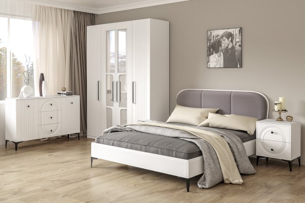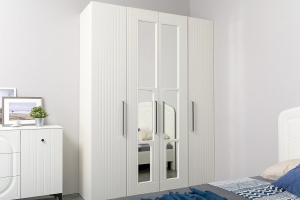 Нестандартно и интересно решён декор двустворчатого шкафа. Зеркало накладывается изнутри фасада, проявляя таким образом сквозную ажурную фрезеровку.