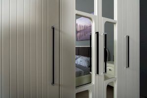 Вся лицевая фурнитура металлическая, графичное и стильное сочетание черного и хромированных деталей эффектно расставляет акценты на мебели.