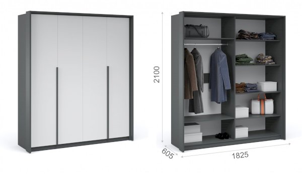 Функциональный распашной щкаф с массивными ручками контрастного цвета включает в себя вместительные полки и отделения со штангой, что позволяет создать систему для хранения вещей различного назначения. Встраиваемая в портал LED подсветка – оригинальное дизайнерское решение и дополнительный источник освещения. Современные цвета декора корпуса и белоснежный фасад добавят в жилое помещение света, уюта и комфорта. Идеально компонуется со всеми модулями системы Мишель.