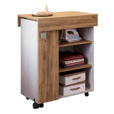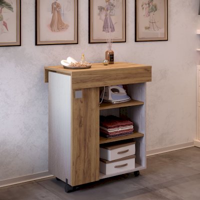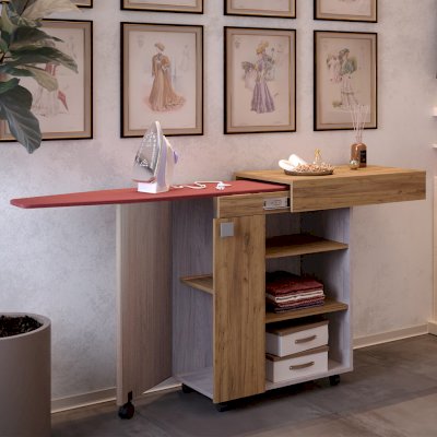 Невероятно практичная вещь – тумба Тео. Все дело в ее многофункциональности, ведь при необходимости модель с легкостью трансформируется в гладильную доску. Изделие дополнено полками, на которых можно хранить утюг и необходимые вещи, а также колесиками для большей мобильности. Тумба точно выручит владельцев малогабаритных квартир.