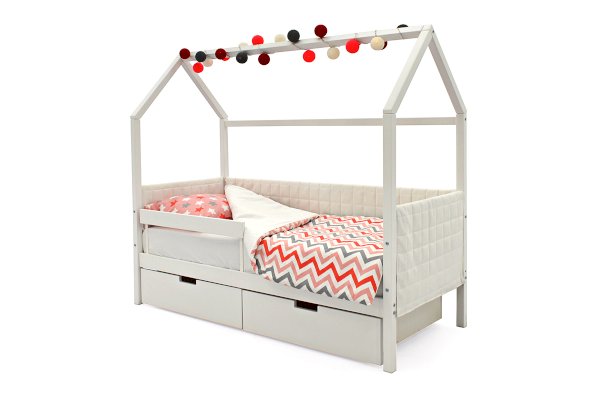 Кровать-домик легко превращается в целый замок для игр с помощью разноцветных тематических игровых накидок. Текстильная крыша на домике создаст ребенку уют и защищенное пространство.