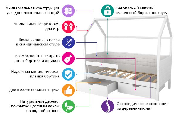 Кровать оборудована манежным бортиком, который защищает малыша от падения во время игр. А для обеспечения дополнительной безопасности малыша во время сна можно приобрести съемный бортик. Особенность его в том, что он закрывает кровать не по всей длине, а только ее часть, благодаря такому конструктиву, ребёнок легко сможет сам забираться на свое спальное место.