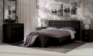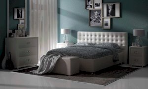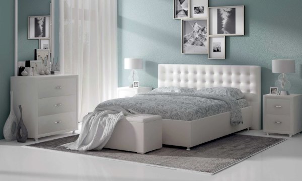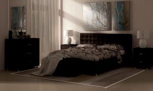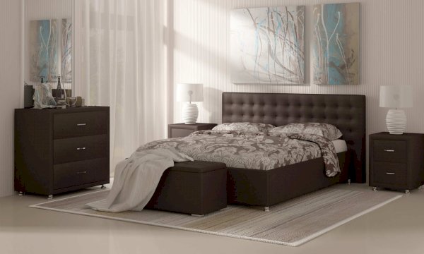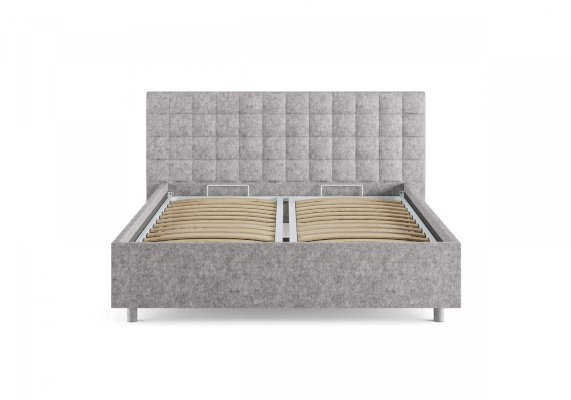 Современная и стильная интерьерная кровать. Модель изготовлена из ДСП и ДВП. В комплект кровати входит кроватное основание. Каркас основания выполнен из металла, ламели - из берёзы. При необходимости в комплект можно включить подъемный механизм с бельевым ящиком, который существенно увеличит объем хранения вещей, а так же позволит легко производить уборку пыли под кроватью.