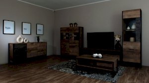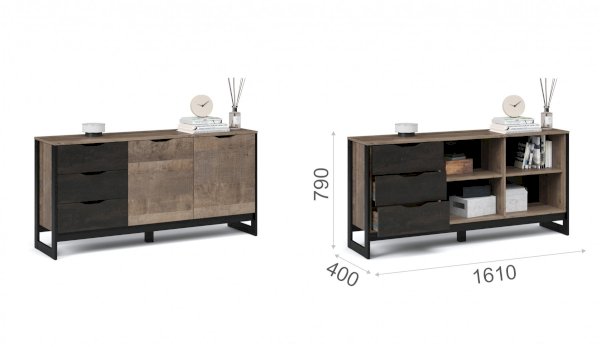Функциональный вместительный комод в стиле лофт, оснащен тремя ящиками на телескопических направляющих и закрытыми полками для хранения вещей и аксессуаров. Отсутствие лицевой фурнитуры подчеркивает минимализм и геометрию модуля. Особенность дизайна – это сочетание реалистичных по цвету и тактильности трендовых декоров, которые соответствуют последним городским тенденциям. «Дуб Гранж» привлекает имитацией вручную обработанного дерева и выразительной зернистой текстурой, характерной формой досок. Стильный серый цвет «Железного камня» с металлическими разводами и новая текстура состаренной штукатурки в сочетании с гладкостью металла вносят индустриальный колорит. Оригинальные ножки-опоры из МДФ контрастного цвета придают изюминку интерьеру.