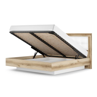 • кровать оснащена подъёмным основанием и вместительным бельевым ящиком, в котором можно разместить большое количество вещей или постельные принадлежности. Подъем основания обеспечивает надежный газлифт. Конструкция кровати устроена таким образом, что бельевой ящик углублен в пространство под кроватью, что создает эффект парения кровати;